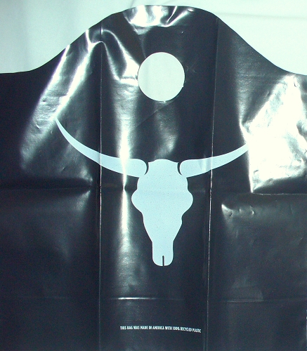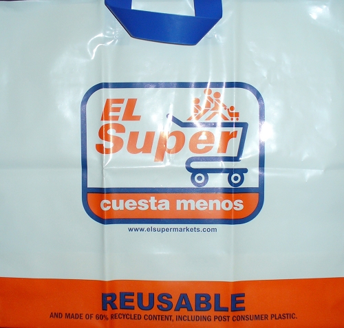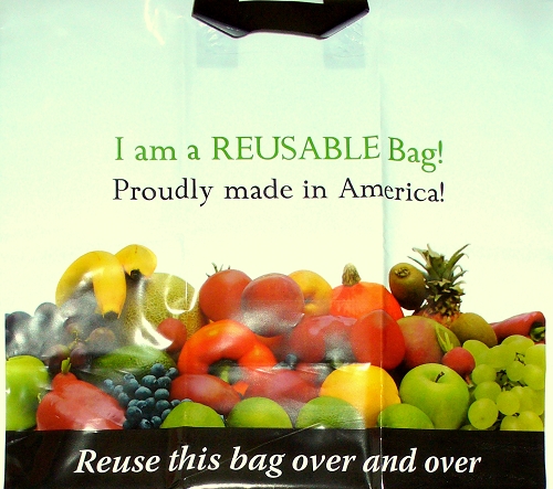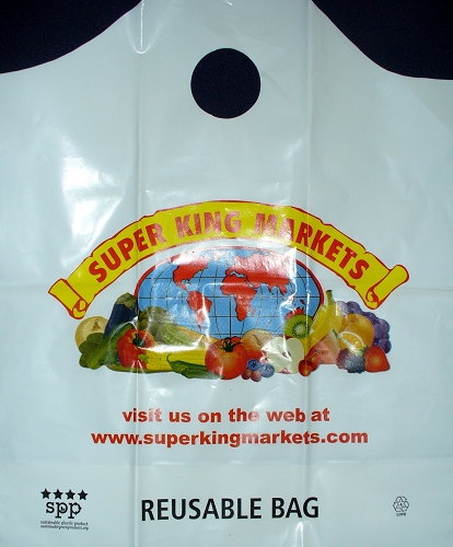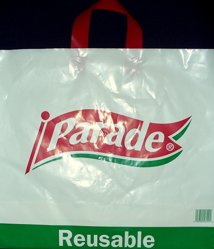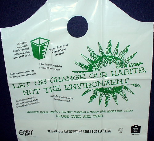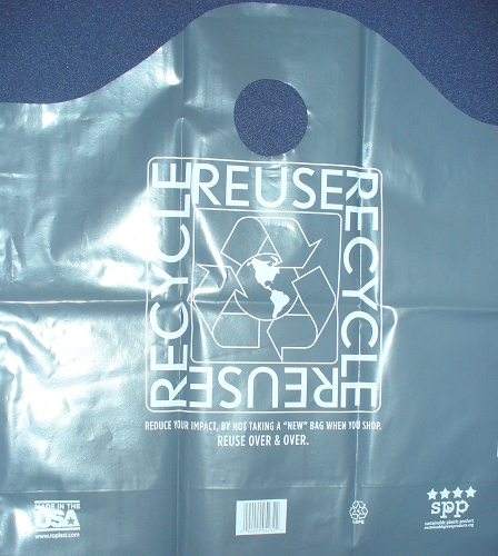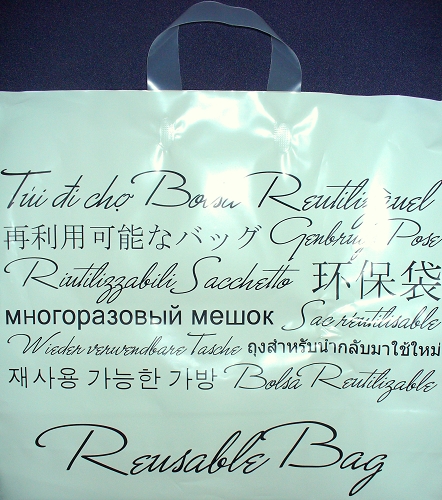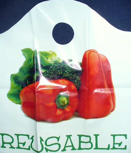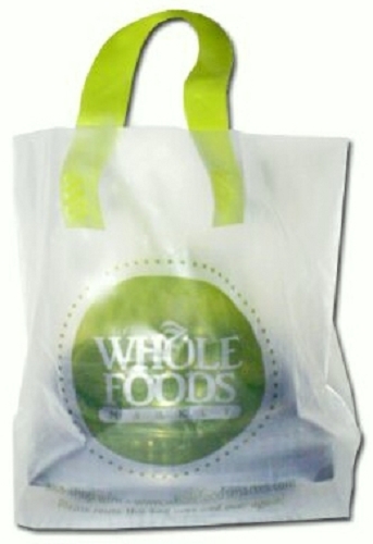 green plastic t-sacks, and 100% recyclable/reusable soft loop handle bags.